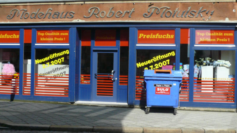 Die Chemnitzer Straße - einst die Einkaufsmeile - öd und leer... Über einem Ramschladen wird plötzlich ein Schriftzug wieder sichtbar - vergangene Zeiten... |
