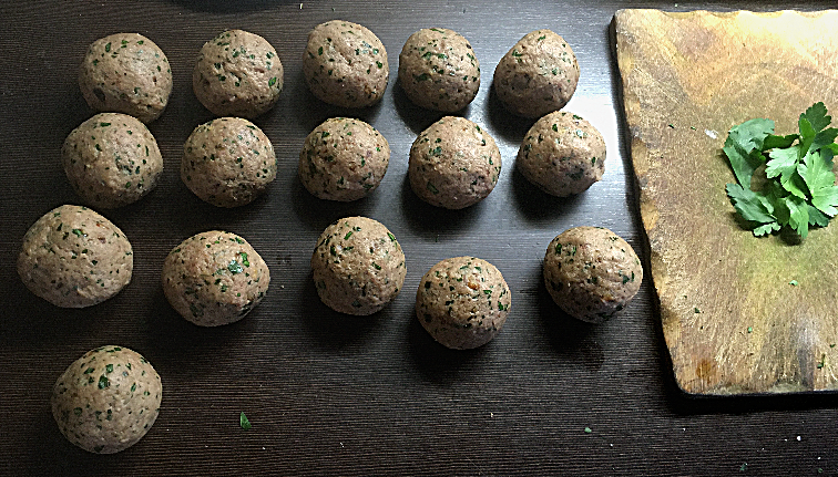 In der Zwischenzeit die Brühe zum Sieden bringen. Aus dem Fleischteig die Knödel formen (á 40g gibt 16 Klößchen). In der Brühe kurz aufkochen und ca. 20 Minuten in der nur noch leicht simmernden Brühe köcheln lassen. Kurz vor dem Servieren die noch etwas Petersilienhack die Brühe geben.