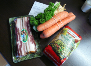 500g Grüne Schälerbsen, 3 Kartoffeln , 3 Möhren, 200g Rauchfleisch, ein Stück Porree, 50g Knollen-Sellerie, Bohnenkraut.