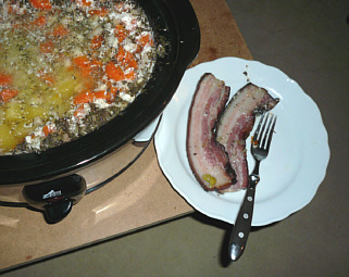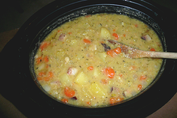 Ja, so sieht ein Erbseneintopf aus – und er schmeckte auch so. Die Erbsen waren – obwohl nicht vorgeweicht – wider Erwarten weich und zerfielen.